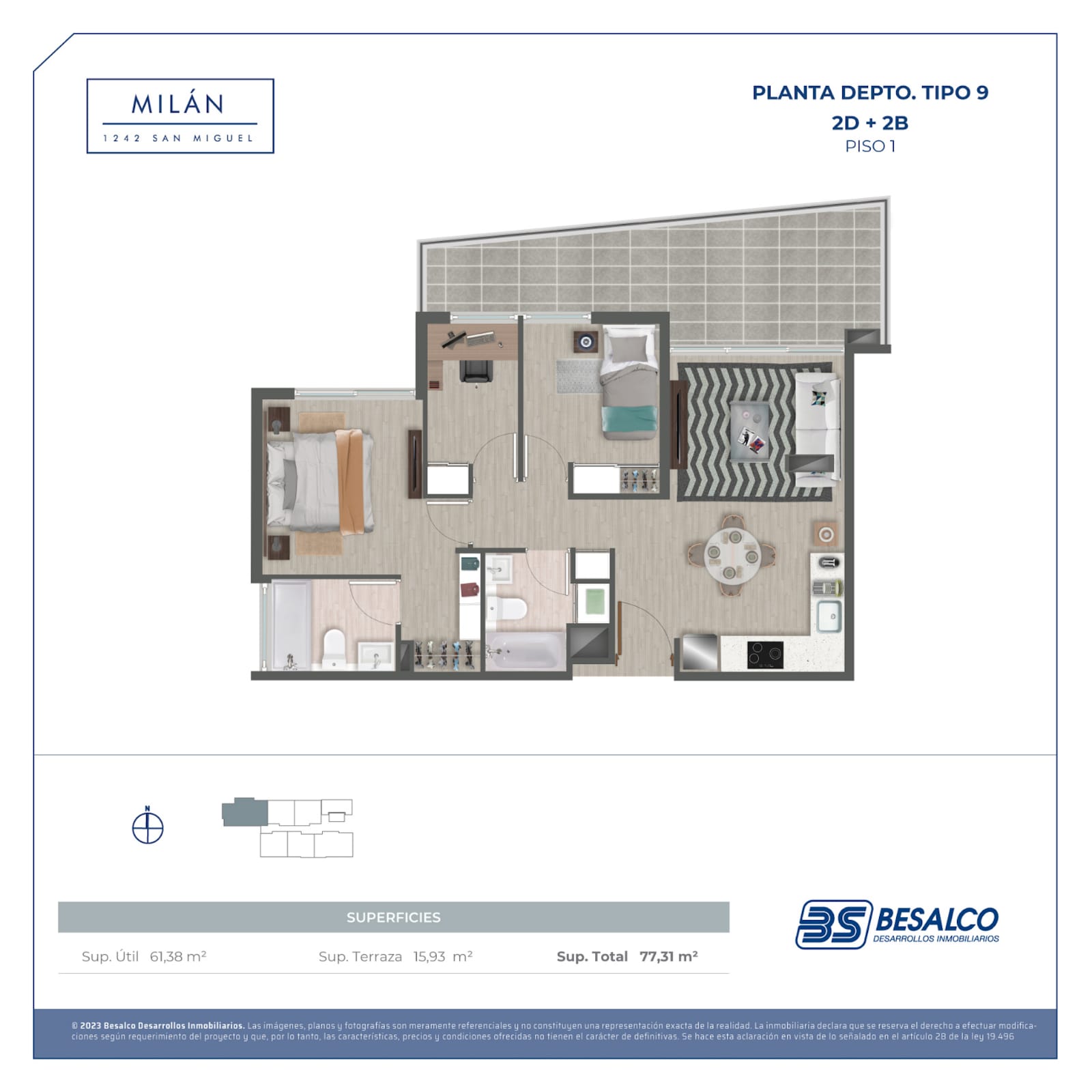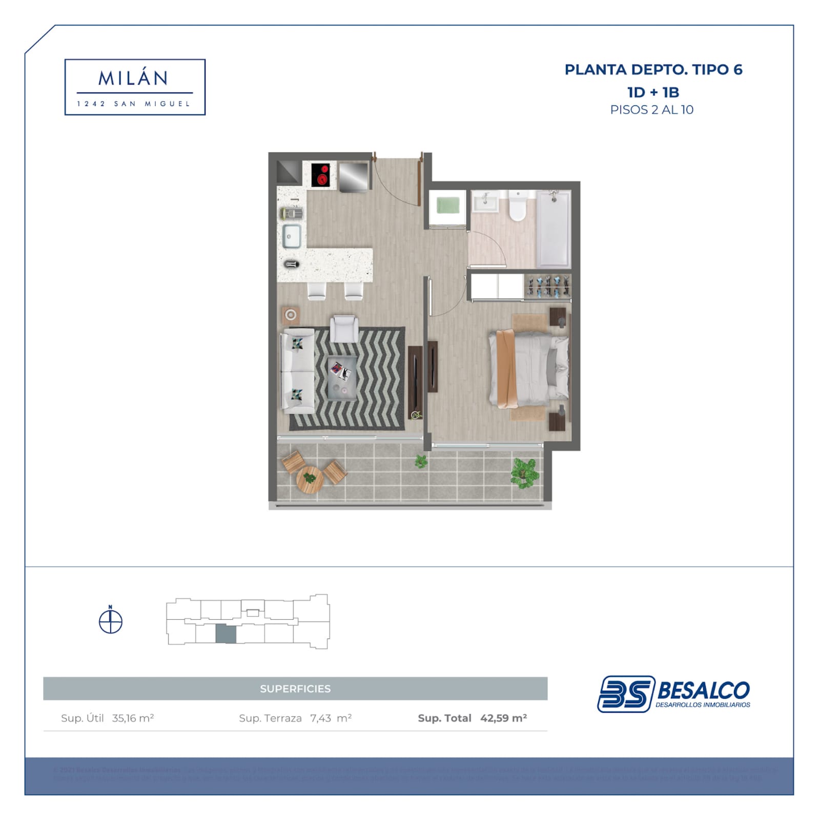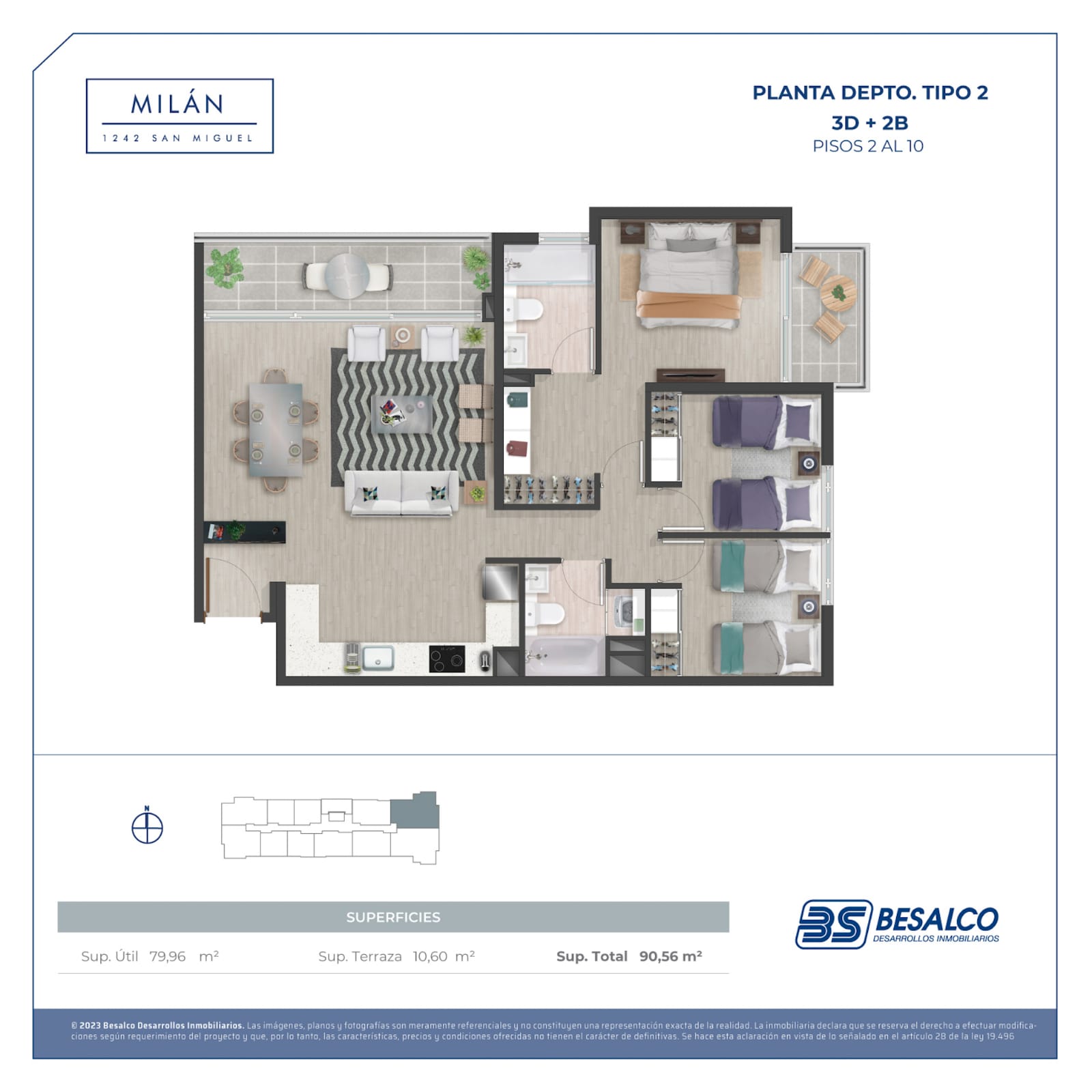 El edificio ofrece departamentos de 1, 2 y 3 dormitorios, con superficies que van desde 35,16 m² hasta 79,96 m², diseñados para aprovechar cada espacio al máximo.