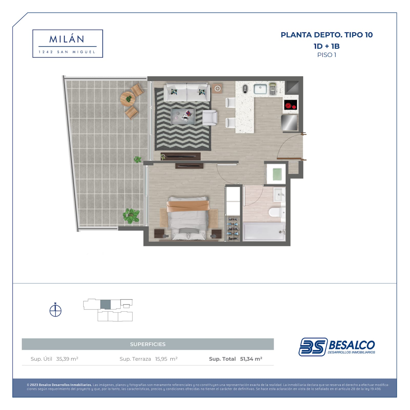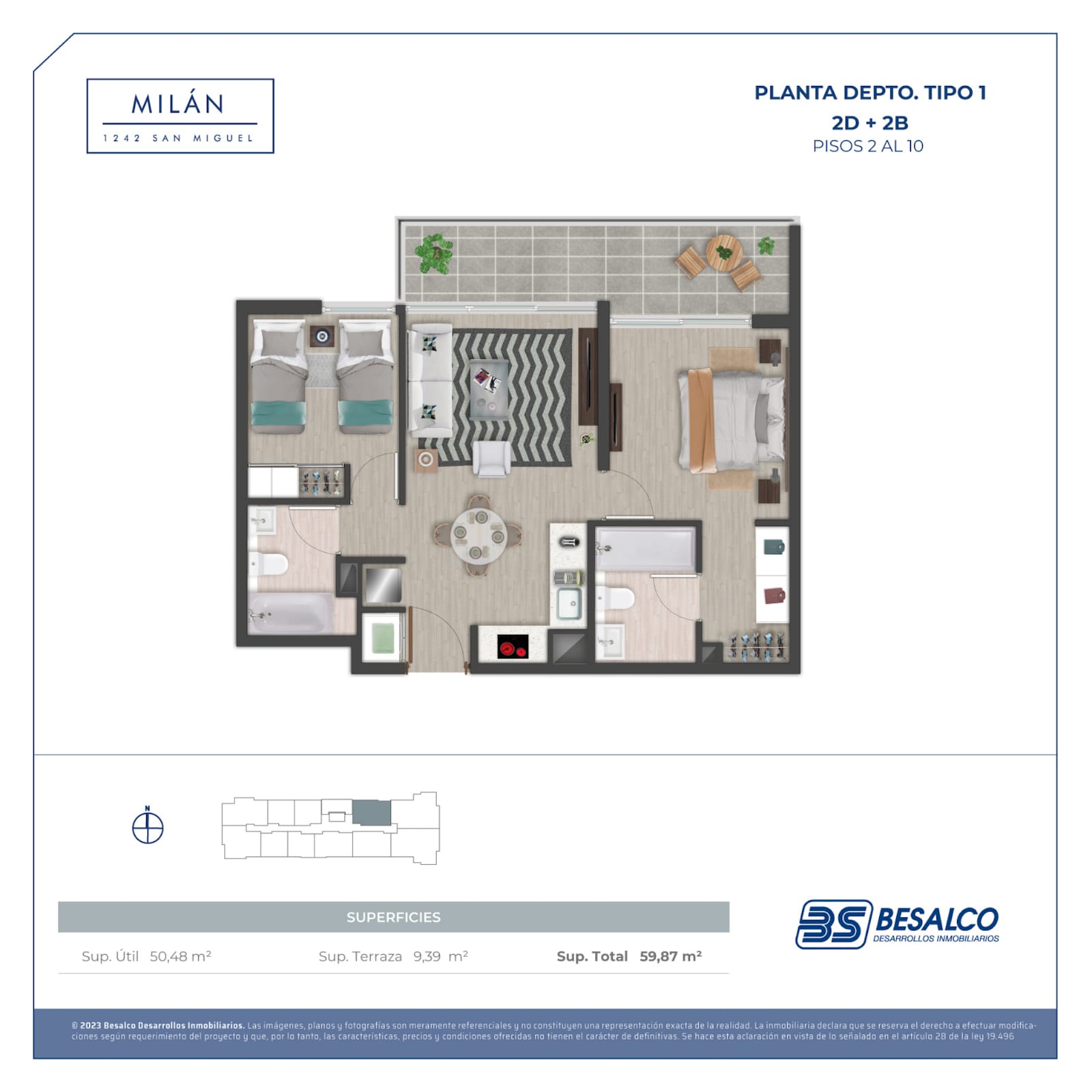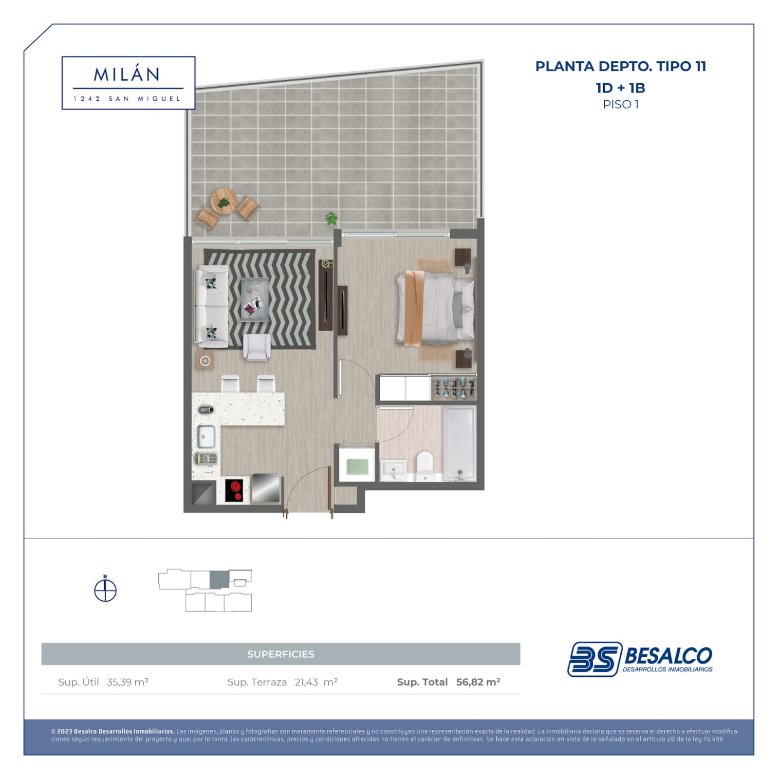 El edificio ofrece departamentos de 1, 2 y 3 dormitorios, con superficies que van desde 35,16 m² hasta 79,96 m², diseñados para aprovechar cada espacio al máximo.